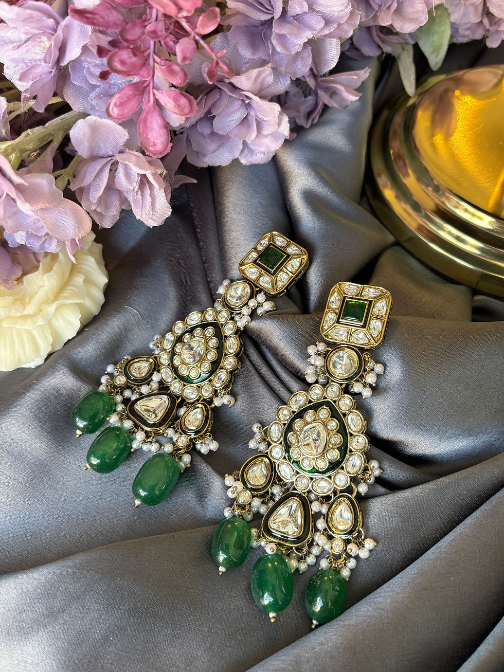 Emerald Green polki Kundan long Necklace Set