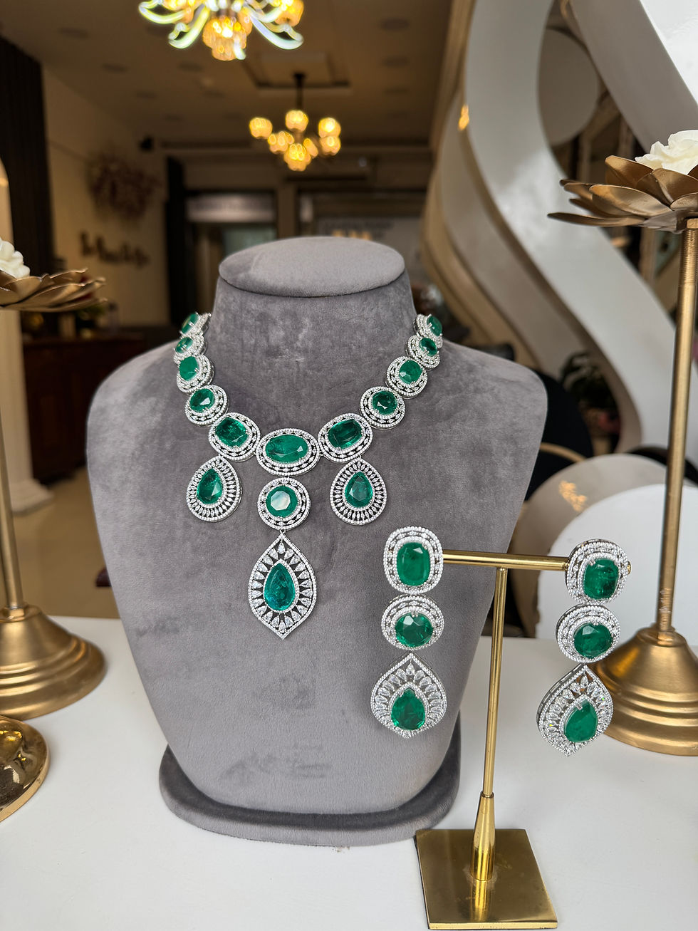 This refined silver-finish AD jewellery set features a delicately crafted leaf-inspired necklace paired with matching drop earrings. Accented with sparkling cubic zirconia stones and graceful drop detailing, the set offers a modern yet elegant look, perfect for festive wear, parties, and special occasions.